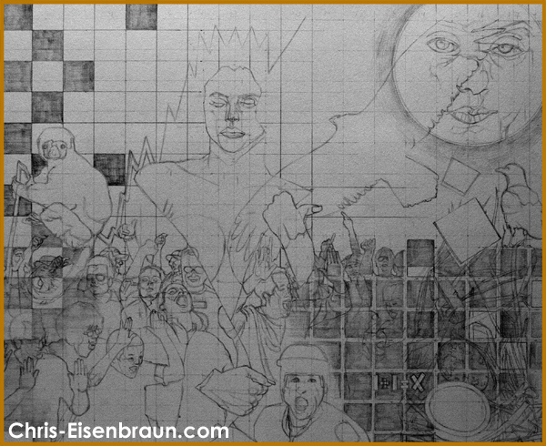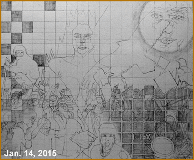 FACEBOOK (Jan. 14, 2015): NEW ART. I put a layout together in the computer at the beginning of the artist retreat. I pushed and pulled images around, TRYING to follow the tenuous thread laid down by the muse. TRYING to write another story using symbols laid down in dream speak style (tri-layered with potential context simmering..., from deep within the collective unconscious). My ONLY concern... was to pull a new work of art across the border of the mind's eye. THEN I pulled the printout out of the computer and headed into the studio to make it real. Me, the artist, the technician, took one good look at the layout... and said a number of choice four letter words. Impossible was ONE of the very first coherent thoughts. INSANE soon followed (as a choice epithet). LOL. I have laid a lightly penciled graphite wash across the paper in key spots ... because THESE areas ... need special treatment. I don't know if you can see ANYTHING, even though I darkened the image so you can SEE the lines. I'll just say, "It's crazy" and I hear your answer.... "what's new?" Ha. NEXT