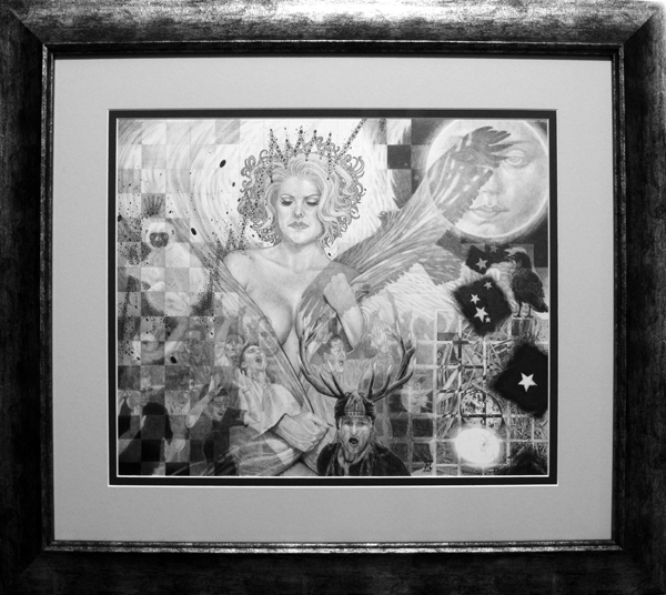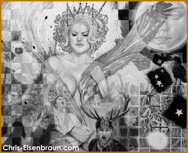 FACEBOOK (June 9, 2016): THE SKY IS FALLING. I have the paperwork on my desk to fill out and turn in tomorrow for the member's show at the Morean. I'm going to put "The Red Queen Effect" in the show (coming soon: July-ish). I'll put the details up soon. BUT... here's one for you. One of the things I really like about this drawing.... it's a symbol from an old, old tale... of Chicken Little.... the one who kept running around yelling that the sky was falling (because an acorn hit him on the head). That story (according to wikipedia ) goes back more than 25 centuries... and it is STILL relevent. I didn't do this on purpose. There's no chickens in this drawing. Just a sky falling. It's something the collective unconscious SHOWED me after, .... when the drawing was done. LOL. The muse is so cool... and (apparently) has one hell of a sense of humor.