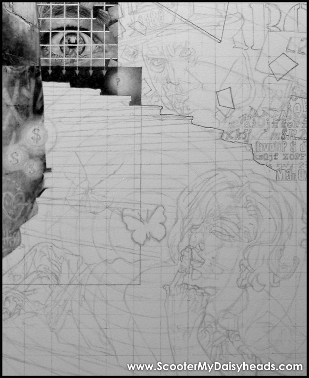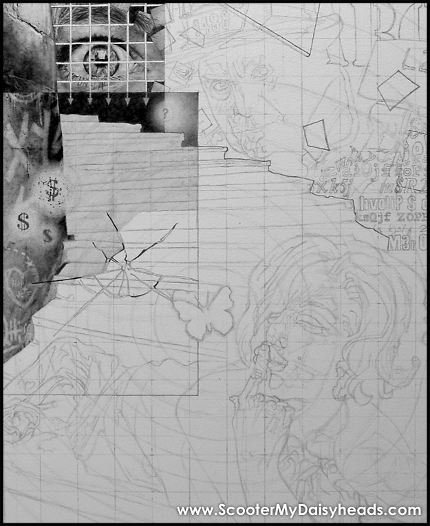 Sooooo, after about twenty minutes of pacing around the table, around the room, etc. ....I picked up the eraser and started erasing the graffiti into the drawing... NEXT -