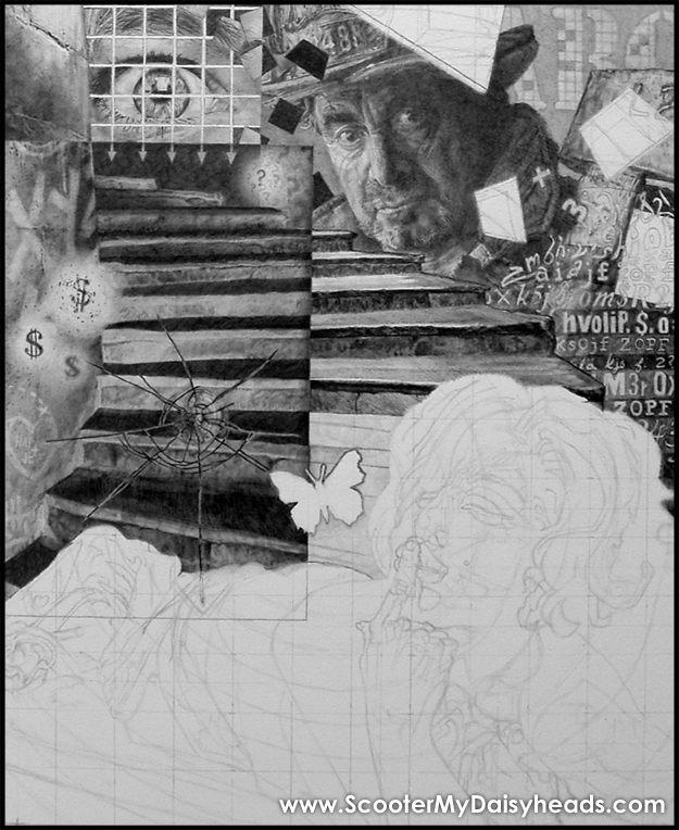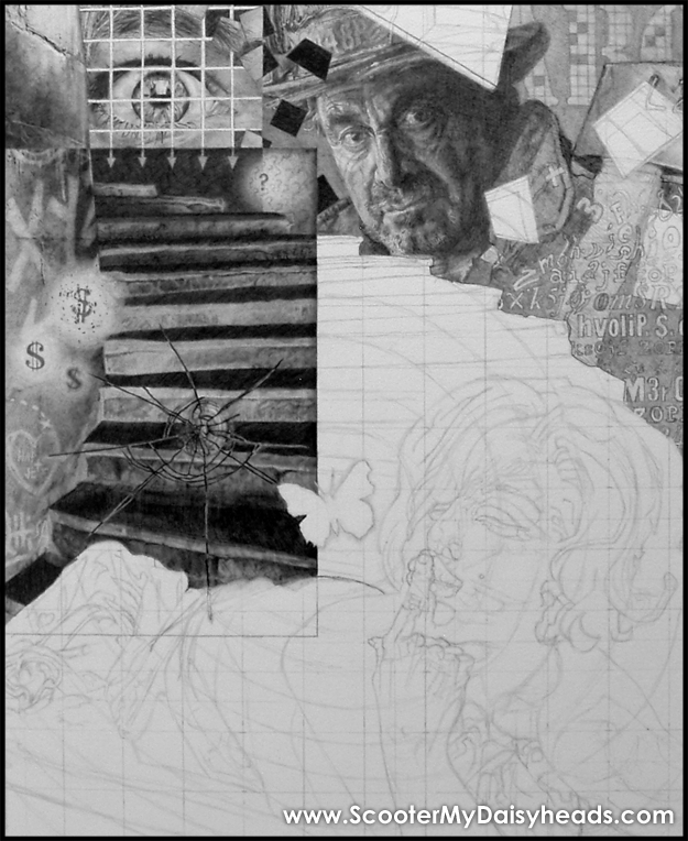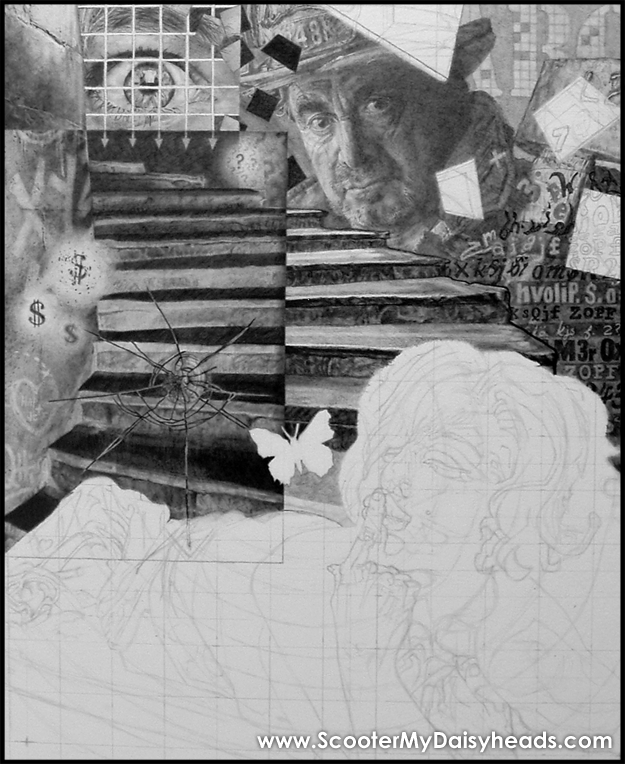 Wow. I just spent FIVE DAYS DRAWING (yeah!)... and I went DEEP into the Art. Dark bars were added to the text on the right. The right-hand side of the stairs is becoming REAL. And...one of the things that I found that I NEEDED to work on, was the other side of the staircase... the part viewed through the negative pane. I NEEDED to make it go DOWN... more. Who knew? I didn't. Soooo, I played with the arrow. Added a dark swath and marks in the wall. All emphasizing the downwards motion of THAT part of the stairway. While doing this, I had to re-work the dollar signs constantly (while moving the arrow UP a tad bit so you can SEE it a little better :) I can FEEL the trust growing (between my fingers and subconscious). There are MANY ways to make THAT statement. I could say that the whispers from the paper are getting louder... or that the muse is dancing round the studio in a VERY loud and complex sway. Or that... (as Shelley would say) I am tuning into a mystical wind.... Nah. Sorry, but I can't say that last one. Too grandiose. LOL. What it all boils down to is that the communication stream from the collective unconscious TO THE FINGERS... appears to be growing in intensity. This drawing is getting to be insane! I am starting to SEE so many symbolic communications... statements... that have been drawn into this work of art. Things that I had JUST DRAWN without understanding "why" are starting to make SENSE ...AND...the really crazy thing is that if I had tried to draw any ONE of them....ON PURPOSE... it would have come off as JUST hollow cleverness. THIS is a full blown statement using dreamwork symbol-ology baby. The dollar signs. Wow. The fireman. The bars of text. Wow again. IF I HAD sat down and tried to draw a statement about different kinds of money... on purpose... it would have been shallowly clever Art. AND... also, ...very boring Art. The dollar signs are just a teeney bit of the LARGER conversation... that is THIS artwork . THIS IS EXACTLY why I am trying SO HARD to draw direct from the subconscious. The language of symbols as used by the dreaming mind... is incredibly complex and infinitely varied. It's ALL SYMBOLS. Human symbols. One language...so many ways to be interpreted. BIGtime. It's really crazy how this language works. Anyway. This is just one very small corner of a complex very surreal drawing... that I am JUST DRAWING right now. Some things you can't help but notice (i.e. the dollar signs)... but I am not trying to understand... I am just TRYING to listen to the whispers coming off the paper AND DRAW what needs to be drawn :) There is a trust to be kept and I am trying to make Art. This is too many words. I have to stop now. Ugh. NEXT
