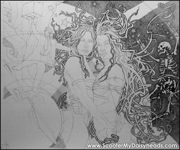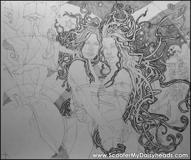 Alfonse Mucha was famous for drawing beautifully patterned hair on graceful female figures. Very art deco/art nouveau. Very beautiful lines. I saw something by Mucha, or an imitator of his art, early on in life. I barely remember the moment but the impact was HUGE. I saw... a drawing (or painting) of a woman with beautiful hair flowing ALL OVER the place. It was the line that drew me. The art deco line. I saw this image on a mirror (...?), in passing. It was just for a minute, ...passing through, from here to there. This glimpse of something ELSE became fundamental to my (early) style. Later on I discovered Mucha and KNEW that I had found IT (the ghost in my machinery). Add this to living in Japan (outside Tokyo) during a few formative years AND the resultant HEAVY exposure to anime at a tender age ...and you can SEE some of the fundamental influences running wildly through the artwork. BIGtime. NEXT