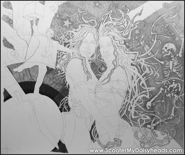 I am JUST going for it. So, step #1 is to set the background colors. Pencils have been picked, gradients chosen ...it's go time. The drawing can begin (again). NOTE: this photo is pretty DARK ...so YOU can see the lightly penciled lines. NEXT