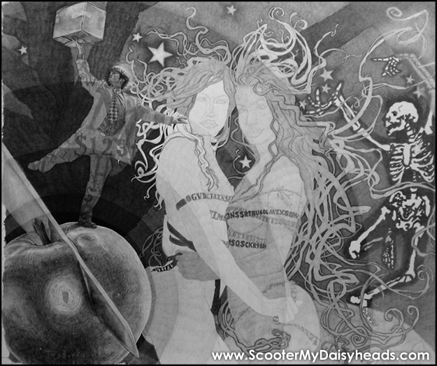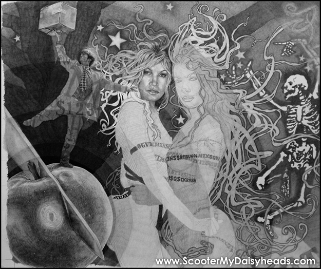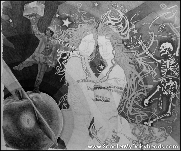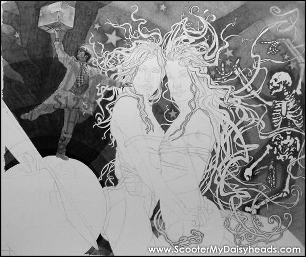 The New Year. A time to cleanse and scrape off accumulated crap and bad ideas. LOL. I can DO that :) That being said, onto a SHOCKING note: a LOT of drawing was done this last weekend. Ha. Ha. Ha. Artist note: the drawing is DEFinitely at an awkward stage but that is ok. I'm only slightly worried at the moment, give me a day or two to get more so. Anyway. A LOT of graphite groundwork was laid and yes, there was (also) tons of re-finessing. More shocking stuff. I DO know that next weekend the focus is going to be on the girls. There are a LOT of decisions that can't really be made until those girls are in focus. Right now it looks like an anime cell, NOT a serious work of surrealness ...and that is distracting. Once the girls are surREAL, THEN I'll KNOW how to tally-ho onwards. Maybe.