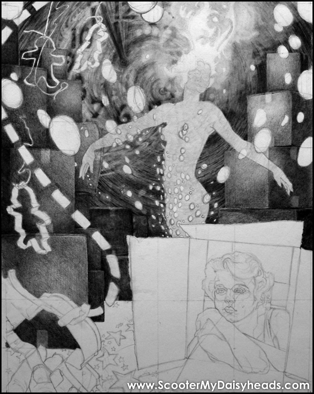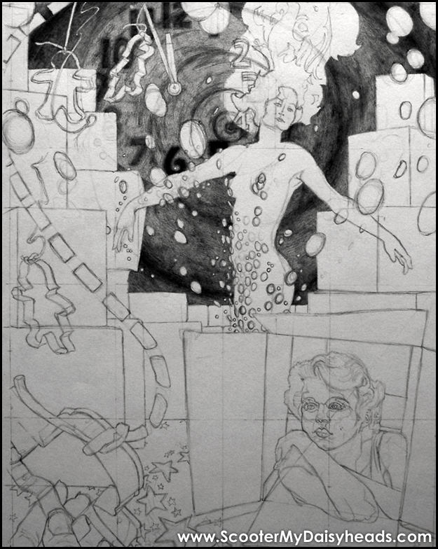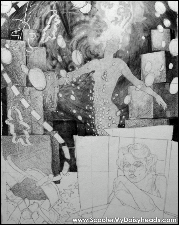 The boxes have me ALL tied up in fits. Once again, there are millions of hardcopy printouts littering the studio as I try to figure out what is UP with these boxes. Initially, they were visualized as an almost abstract, very graphic pattern. There was even a point where they were the pieces of a broken apart chessboard (black and white squares waylaid). BUT....my gut (or my fingers? the pencil?) is/are saying otherwise. Another departure from routine: usually the artwork is drawn from the upper left hand corner down... to keep smudging to a minimum. That is DEFinitely NOT happening here. We're talking complete helter-skelter-ishness. CHAOS. Jeez. This was SUPPOSED to be a very SIMPLE (surreal) sketch. Guess NOT.