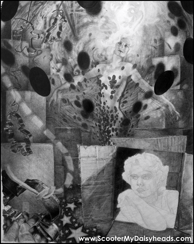The Boxes. That's right: B-O-X-E-S. And, do you want to know the really EXTREMELY funny thing? If I draw them correctly... you won't even notice them. Not really. UGH. BUT...at least those DARN Boxes are beginning to come to light (so to speak <lol>). The lighting..., the idea..., the boxes... are not yet finalized but the concept is getting closer. The fingers are working. My problem was: the boxes and the background seemed to be ABOUT the same shade... or at least that seemed to be the LAST direction (part four of many) that this part of the drawing was headed. BIG sigh. My semi-initial thought was that this was going to be more of a Dutch period sort of deal. I always loved the idea of dark/black forests (etc.) framing small blue spots of sky/landscape found in so MANY Dutch period pieces. So I thought: why not do ditto with boxes and a wildly rotating clock in a sky/ceiling??? hehehe. Anyway. I "thought" that was where this was heading. But that was just as much because...I thought that to DEFINE the boxes would exacerbate the complete confusion the background seemed to be becoming. But then again (even before THAT idea <lol>), I "thought" the boxes were going to be a broken apart chess board. Go figure. My subconscious is keeping this baby DEEPLY under wraps and leaving the conscious mind COMPLETELY in the dark ...and guessing badly. LOL. Anyway. Back to: those darn boxes. Triple friggin' ugh. Regardless of how this "sounds" ...I am getting (somewhat) optimistic. At least, the whole concept is beginning to move FORWARDS. Yeah.