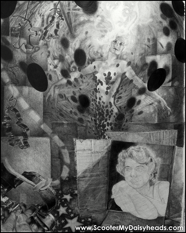 A glow has been added (around the platinum blonde's hair). Jeez, I remembered all of this stuff while I was drawing... I think the photo was an actress from the 30s named Jean Harlowe (pre-Marilyn Monroe). I liked the formulaic styling of her look. You can tell that in her time she was very hot and you can tell that she is from another time. I'm not saying that she her looks aren't STILL awesome, feminine, etc. ...I'm just saying that she's (also) ...very dated and THAT is one of the many, many, many things that work here (on a symbolic level).