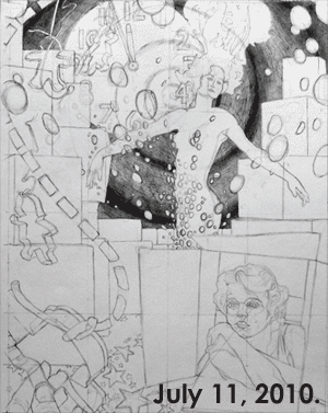 It's kind of cool, revisiting this work at this time (and very embarrassing too, to see how long I've let this sit without an update). BIGtime. I do remember being so INTENSE about every little bit, every tiny centimeter, every single pencil stroke. This part of the artwork was drawn AFTER the artist retreat (obviously). The focus: the girl and the box... -